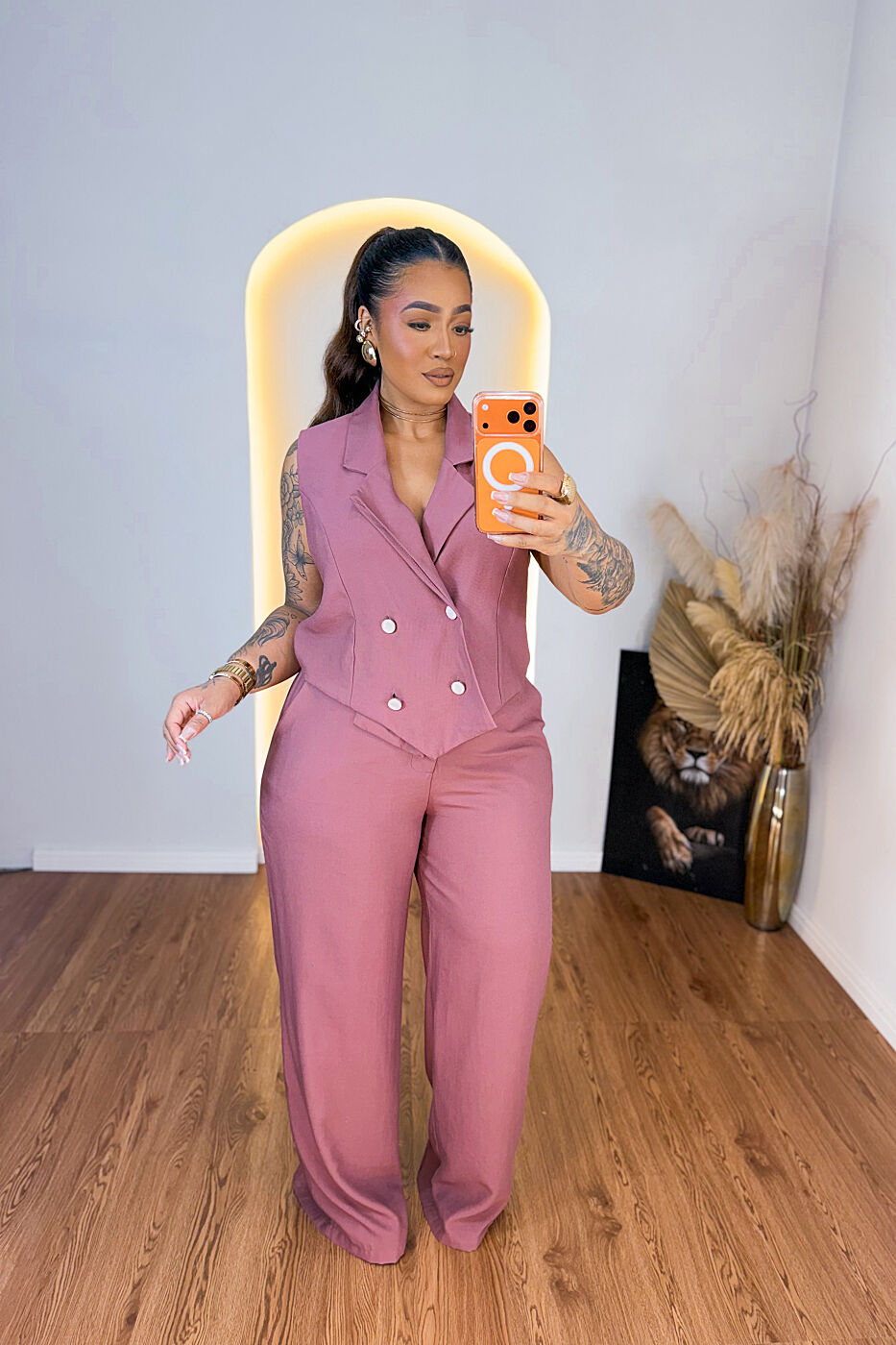 O conjunto é composto por colete e calça em modelagem ampla e confortável, com botões frontais justificando a proposta de estilo enviesado do colete. O tecido é macio ao toque e pensado para proporcionar sensação agradável ao vestir. A cor rosada complementa tendências atuais de moda, agregando sofisticação casual.